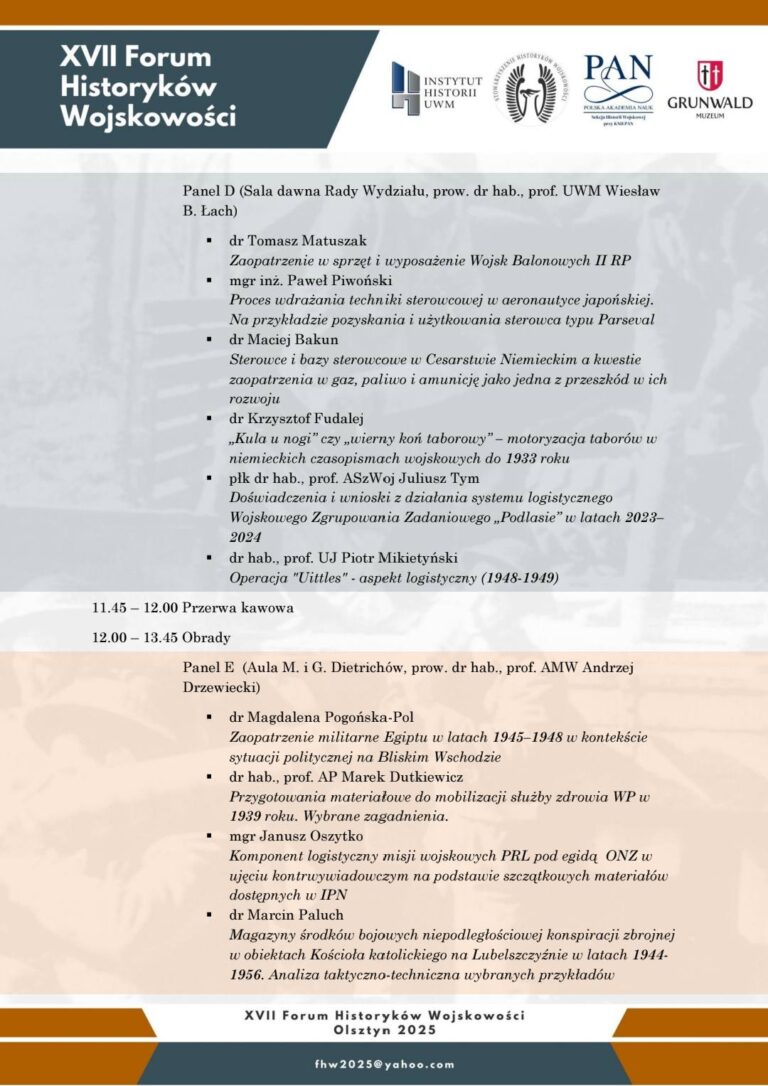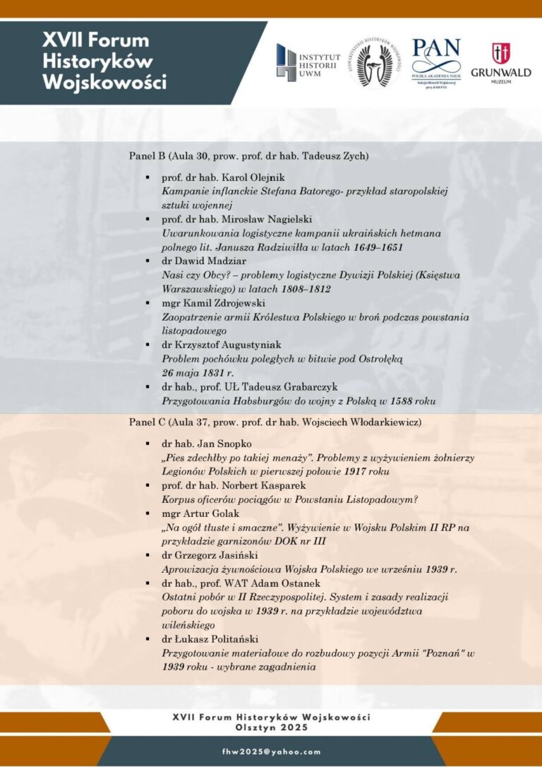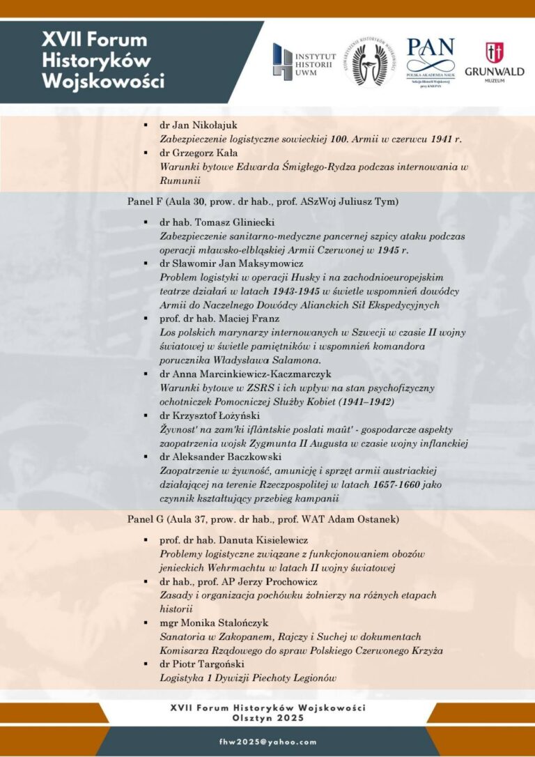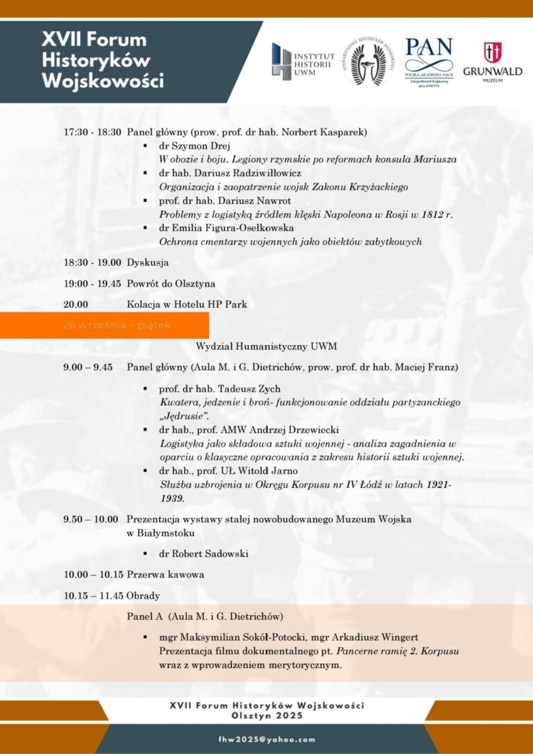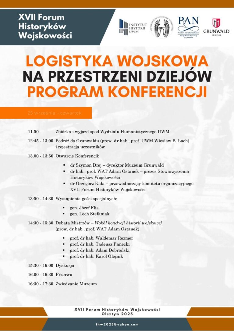 Już wkrótce XVII Forum Historyków Wojskowości, które odbędzie się w dniach 25-26 września br. w Olsztynie i w Grunwaldzie. Tematem przewodnim będzie “Logistyka wojskowa na przestrzeni wieków”. Szczegóły w programie.