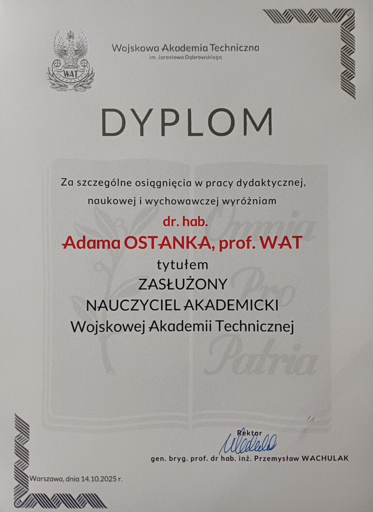 Jednocześnie, w uznaniu za szczególne osiągnięcia w pracy dydaktycznej, naukowej oraz zaangażowanie w rozwój kadry akademickiej, Rektor-Komendant Wojskowej Akademii Technicznej wyróżnił dr. hab. Adama Ostanka, prof. WAT tytułem „Zasłużony Nauczyciel Akademicki Wojskowej Akademii Technicznej”.